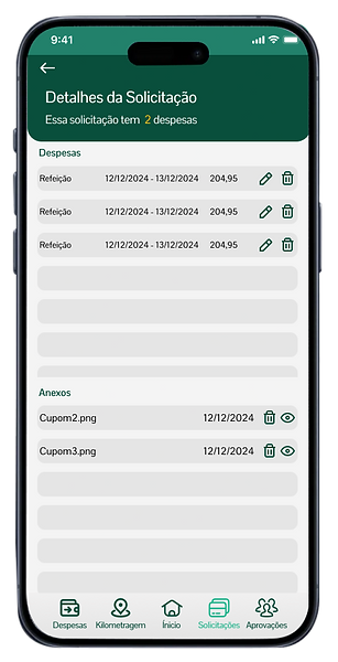 Na tela de solicitação, decidi exibir os cards de todas as solicitações do usuário logado. Ao clicar em um card, serão exibidos os detalhes das despesas dessa solicitação, permitindo que o usuário as edite ou exclua.